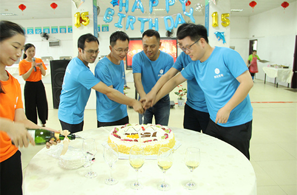 同舟共濟,感恩同行!觥籌交錯,舉杯暢飲!最后,公司總經(jīng)理劉志強先生、董事長(cháng)熊友輝博士及公司高層切蛋糕、開(kāi)香檳,與全體員工舉杯共祝四方光電十五歲生日快樂(lè )!一片歡聲笑語(yǔ)中,四方光電十五周年慶典完美落幕!